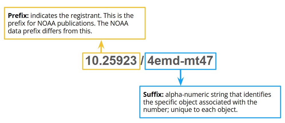 The NOAA Library automatically assigned DOIs to all NOAA publications that are submitted to the NOAA Institutional Repository (NOAA IR). NOAA authors are able to request a DOI prior to submission to the NOAA IR using our DOI Request Form. If you would like to receive a DOI for your dataset, please contact the NOAA National Centers for Environmental Information's Archive.