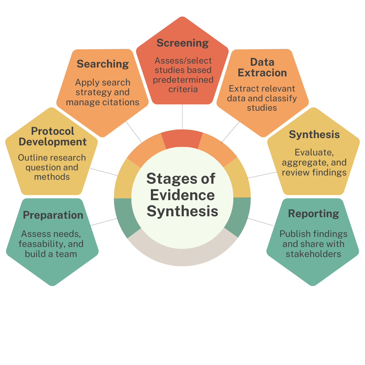 - Determining the evidence synthesis type: Taking into consideration the information needed, determine the most suitable methodology. Be sure to review conducting and reporting guidelines in your review and look at published syntheses.
