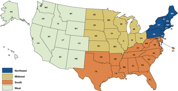 - Pacific (Alaska, California, Hawaii, Oregon, and Washington)