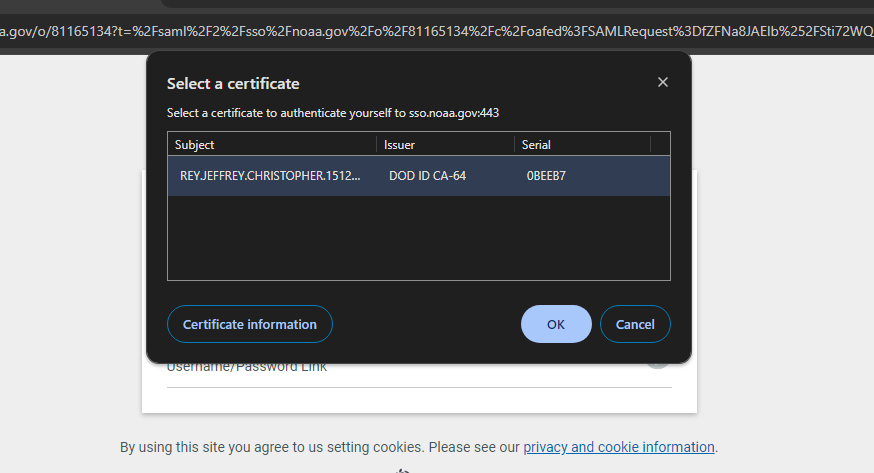 In clicking continue, you will be prompted to enter your NOAA Username and Password. For your NOAA Username, do not enter @noaa.gov at the end.