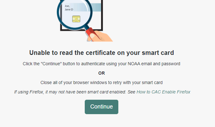 In clicking cancel, you should see the message - "Unable to read the certificate on your smart card". Click the teal continue button.