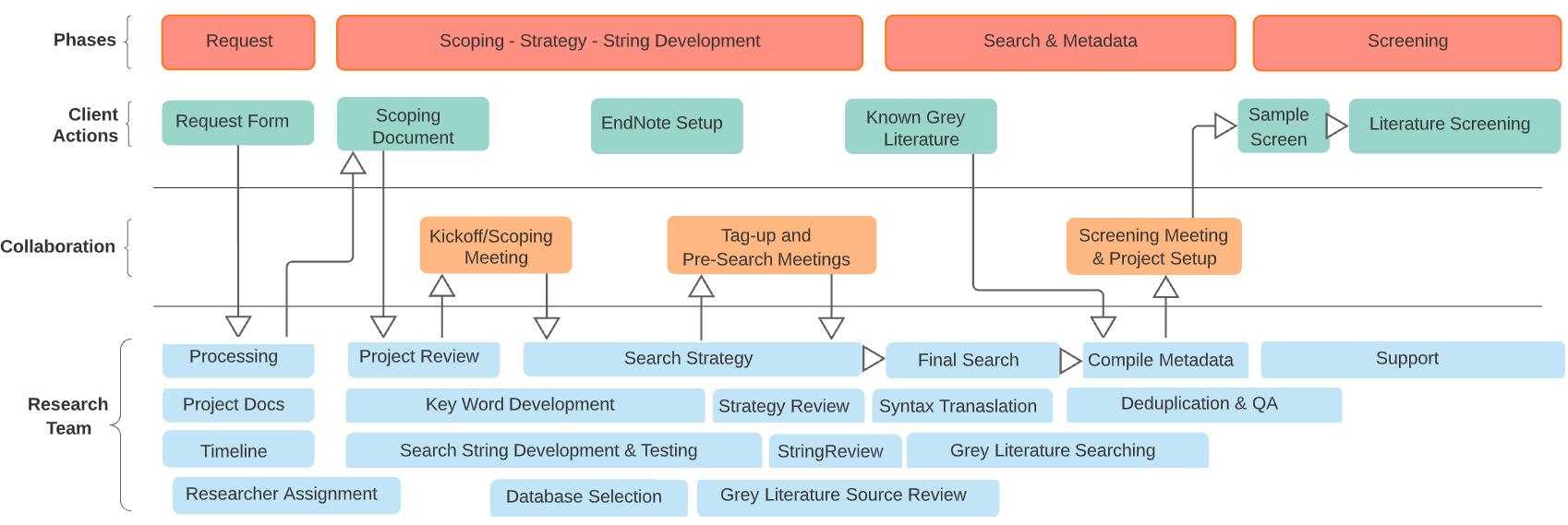 While every project is unique, our team follows a standard process that helps to ensure a successful literature search. This process is broken into four main stages, the Initial Request and Review, the Scoping and Strategy development, the Search and Citation Management, and the Screening. Tasks within each phase require collaboration between the requesting team and the research librarian and many tasks are iterative in nature. Below you will find a visualization of the process and tasks for a generic project. To learn more about each phase of our process, see our pages on each phase of the research process.