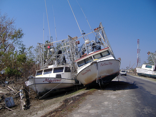 From left to right: Aftermath of Hurricane Katrina; Hurricane Ike approaching Texas; Eyewall of Hurricane Katrina