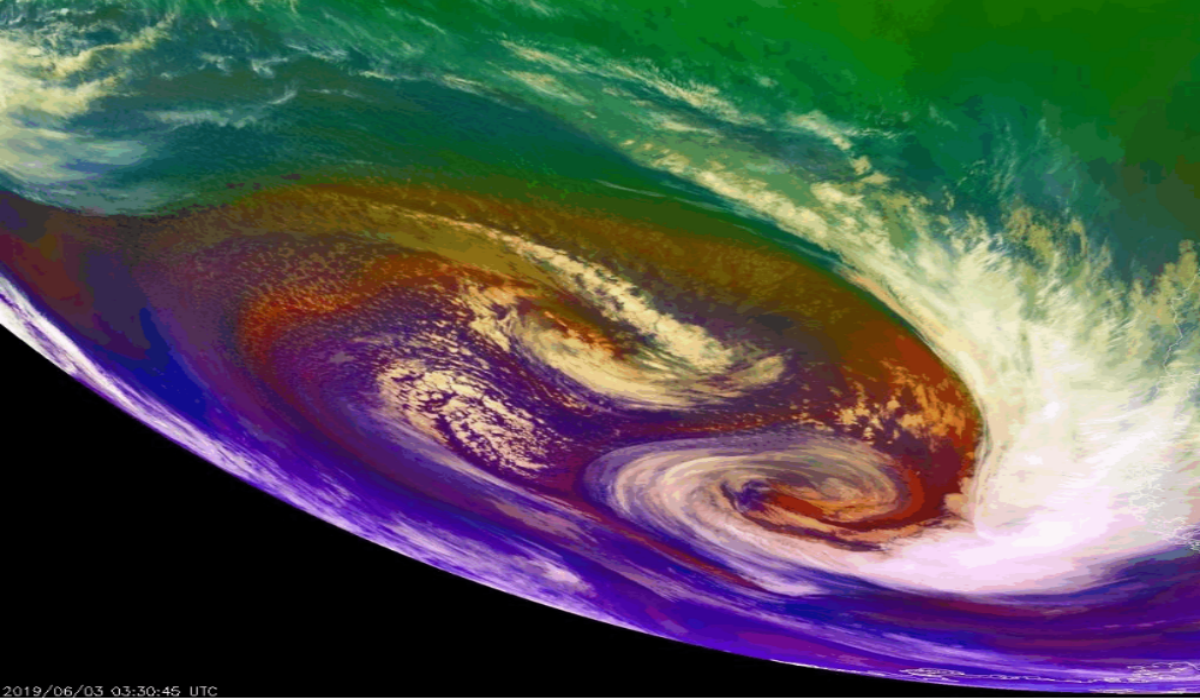 NOAA’s GOES-16 satellite used its Red-Green-Blue Air Mass Band to watch several areas of low pressure rotate around each other off the coast of Chile, June 2-3, 2019. (Image credit: NOAA Satellites)