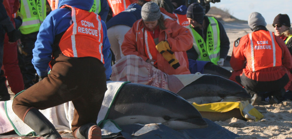 Stranded Atlantic white sided dolphins being assessed by responders from IFAW and NEAQ (Image credit: NOAA)