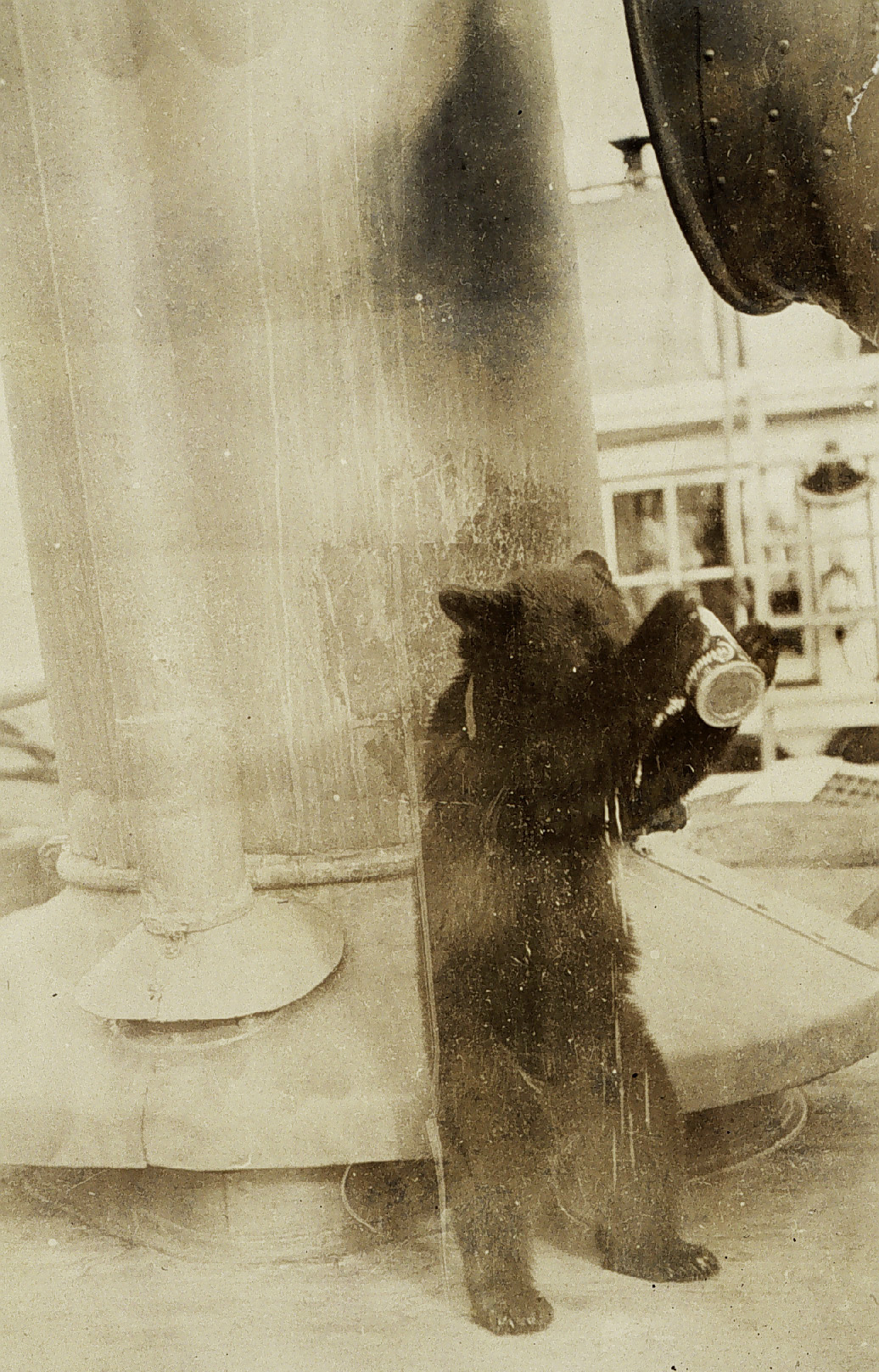 Billy the bear cub, a pet on the USC&GSS Gedney, makes a mess, c. 1912. (Image credit: NOAA)