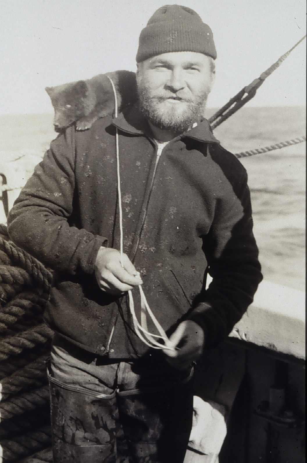 The USC&GSS Pioneer’s pet Arctic fox seems quite content on crewman Alaskin’s shoulder.