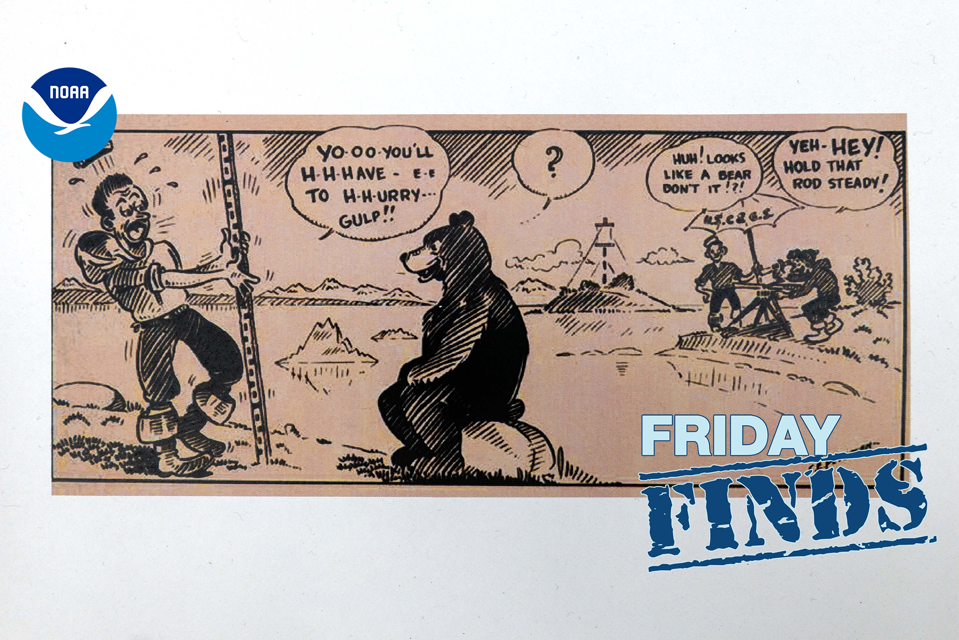 NOAA’s survey teams spend a great deal of time outdoors making sure maps and charts are accurate, so it’s no surprise they’ve had brushes with wildlife over the decades. Petersen’s cartoon shows a light-hearted version of what was probably a scary encounter: surveyors at the plane table setup (far right in the cartoon) noticed that their rodman (far left) was running to each surveying spot, then frantically waving at them to hurry up and get their readings.
