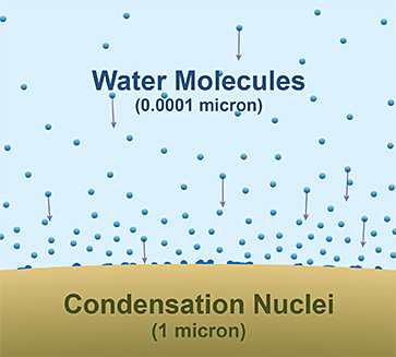 Water is always present in Earth’s atmosphere in some form. However, water molecules on their own are too small to bond together in the formation of cloud droplets. They need a "flatter" surface, an object with a radius of at least one micrometer (one millionth of a meter) on which they can condense. Those objects are called cloud condensation nuclei.