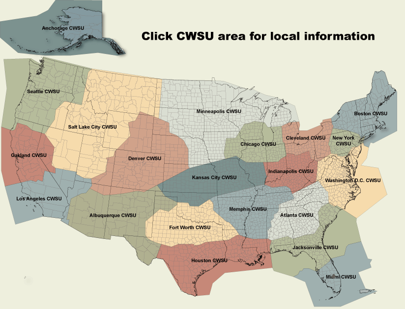 Below is a map of the Center Weather Service Units and their areas of responsibility. Click or select on an image below or use the drop down menu to go to any office website.