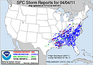 This is precisely what occurred on April 4-5, 2011, when a serial derecho produced over 1,200 high wind reports (blue dots on image right). Wind reports of 60+ mph (100+ km/h) with gusts to 90 mph (145 km/h) felled thousands of trees and caused widespread power outages, in addition to 68 tornadoes.