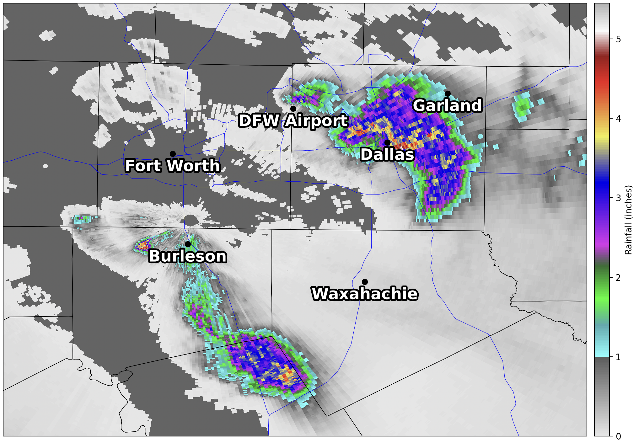 The one hour rainfall estimation product shows the amount of precipitation that has fallen over the last hour and is continuously updated. This short duration estimation is helpful when very heavy rainfall occurs in a short period of time.