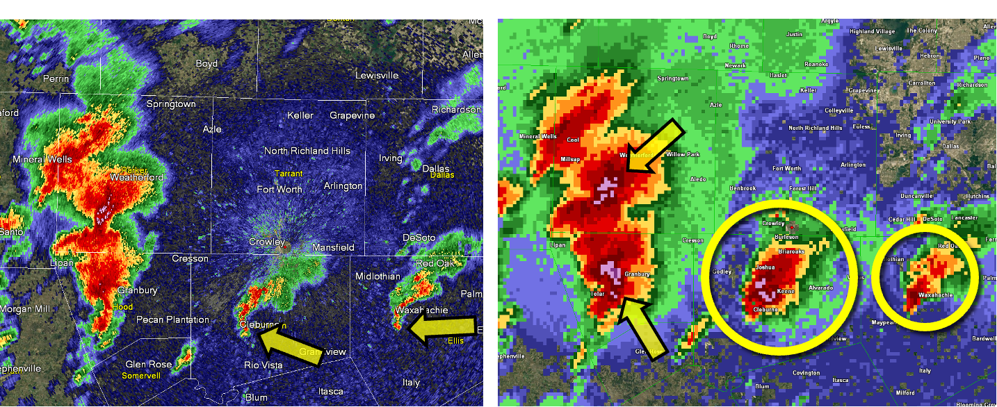 (Left): A cluster of severe thunderstorms approaches Fort Worth, TX, on April 3, 2012, as seen in the Base Reflectivity (0.5° elevation). Notice the two smaller storms (arrows) ahead of the main cluster. These storms have a small “hook” shape to their appearance.