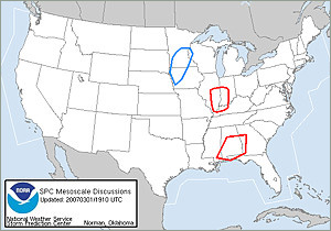 When conditions appear favorable for severe storm development, SPC issues a Mesoscale Discussion (MCD), normally 1-3 hours before issuing a weather watch.