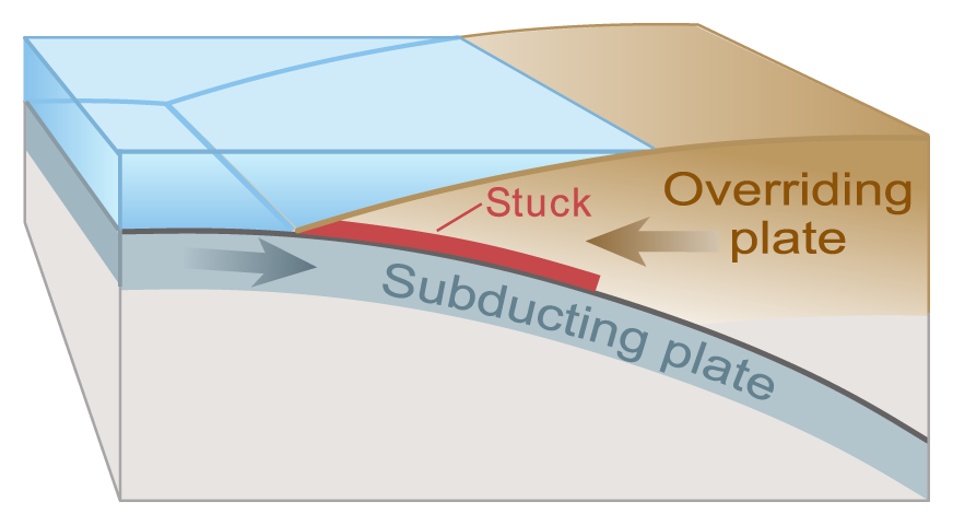 Where the surfaces of these plates catch and lock along their boundary, stress builds up as the rest of the plates continue to move. This takes place over long periods of time.