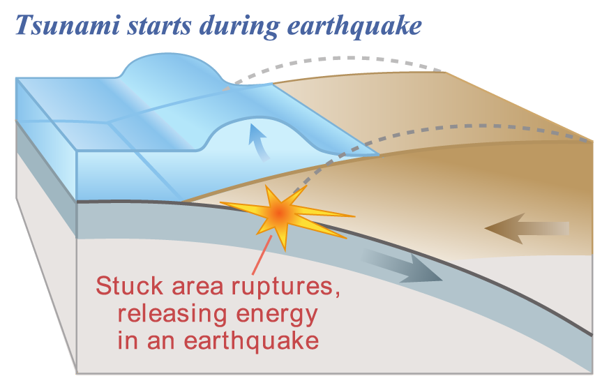 If big enough and close enough to the ocean floor, the energy from such an earthquake can cause the ocean floor to suddenly rise (uplift) or fall (subside). This sudden vertical displacement of the ocean floor is what typically sets a tsunami in motion.
