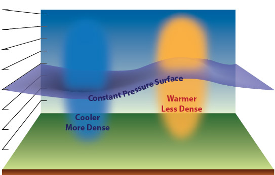 Therefore, the altitude where any particular pressure occurs will be lower in regions of colder air. Conversely, higher air temperatures result in relatively higher altitudes of various pressure levels. This is why, as a rule, the altitude of constant pressure levels decrease from the equator toward the poles simply because it is warmer at the equator than at the poles.