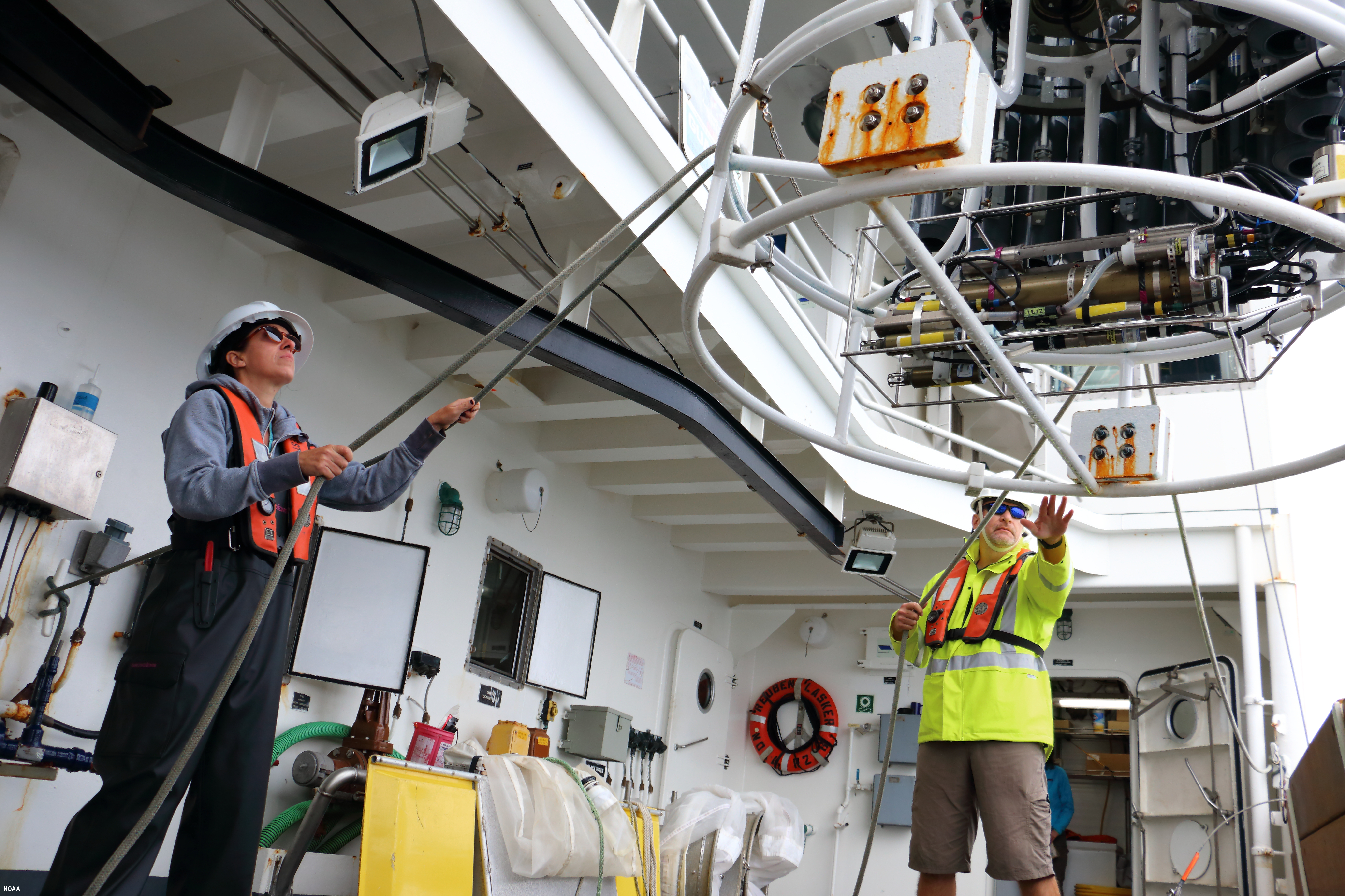 Professional mariners Elan Sprouse and Ed Williams deploy equipment used to measure the seawater’s salinity, temperature and depth from NOAA Ship Reuben Lasker. (Image credit: NOAA)