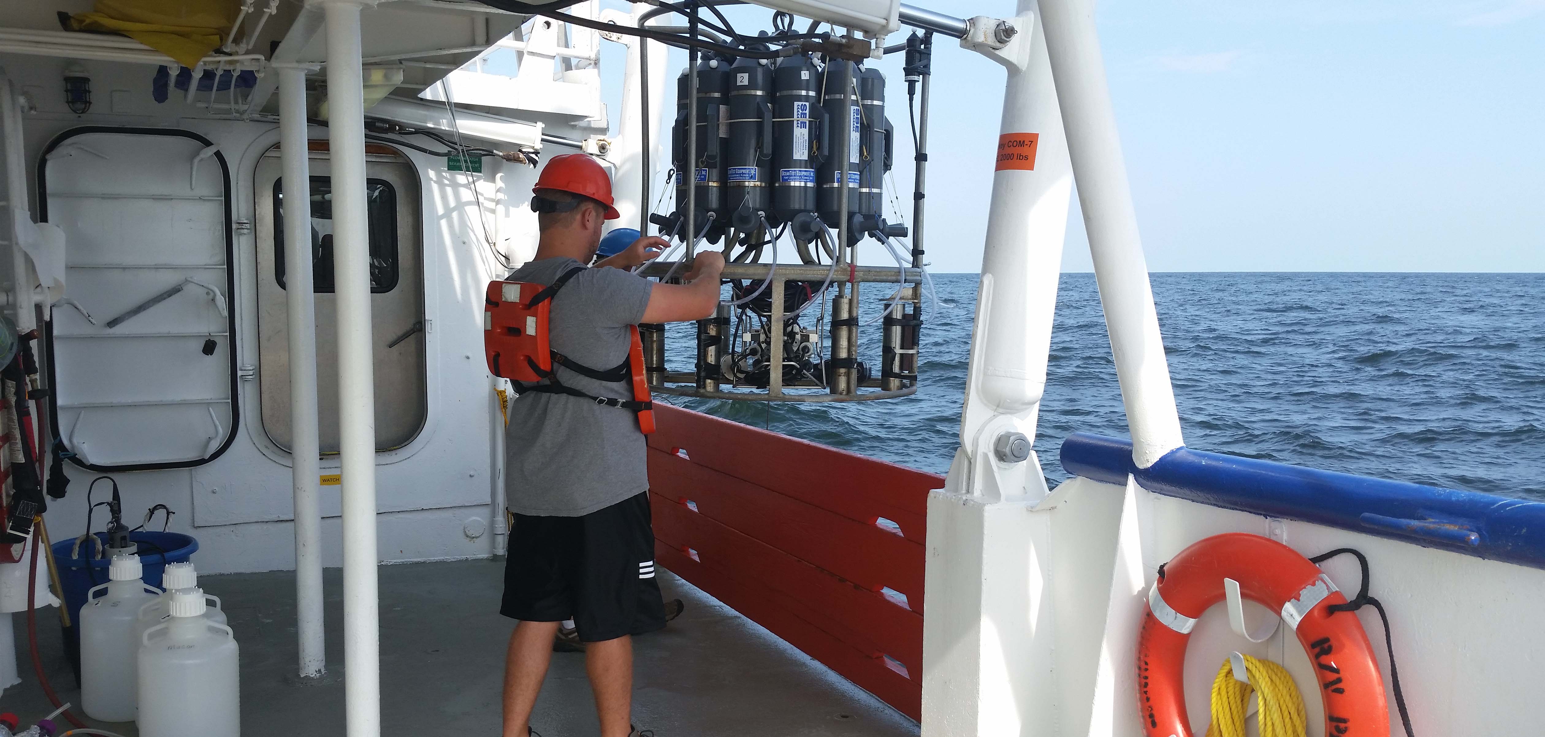 Scientists from Louisiana Universities Marine Consortium deploy a water sensor called a CTD sonde rosette to collect water samples to test for oxygen levels during the 2015 R/V Pelican's shelf wide hypoxia cruise. (Image credit: LUMCON)