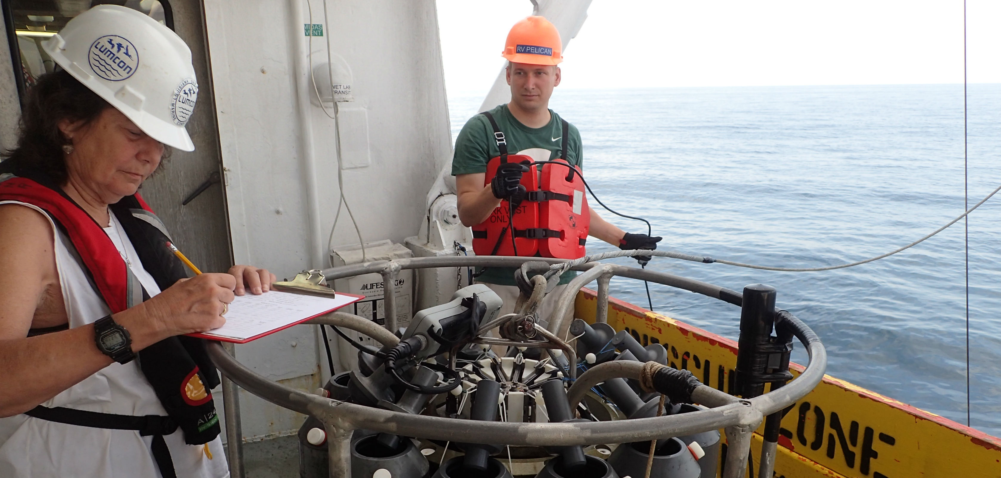 Scientists from LUMCON and NOAA collect oxygen measurements to determine the size of the 2018 Gulf of Mexico dead zone, an area of low oxygen that can kill fish and marine life. This cruise has been performed since 1985, creating an important long term data set for scientists. (Image credit: NOAA)