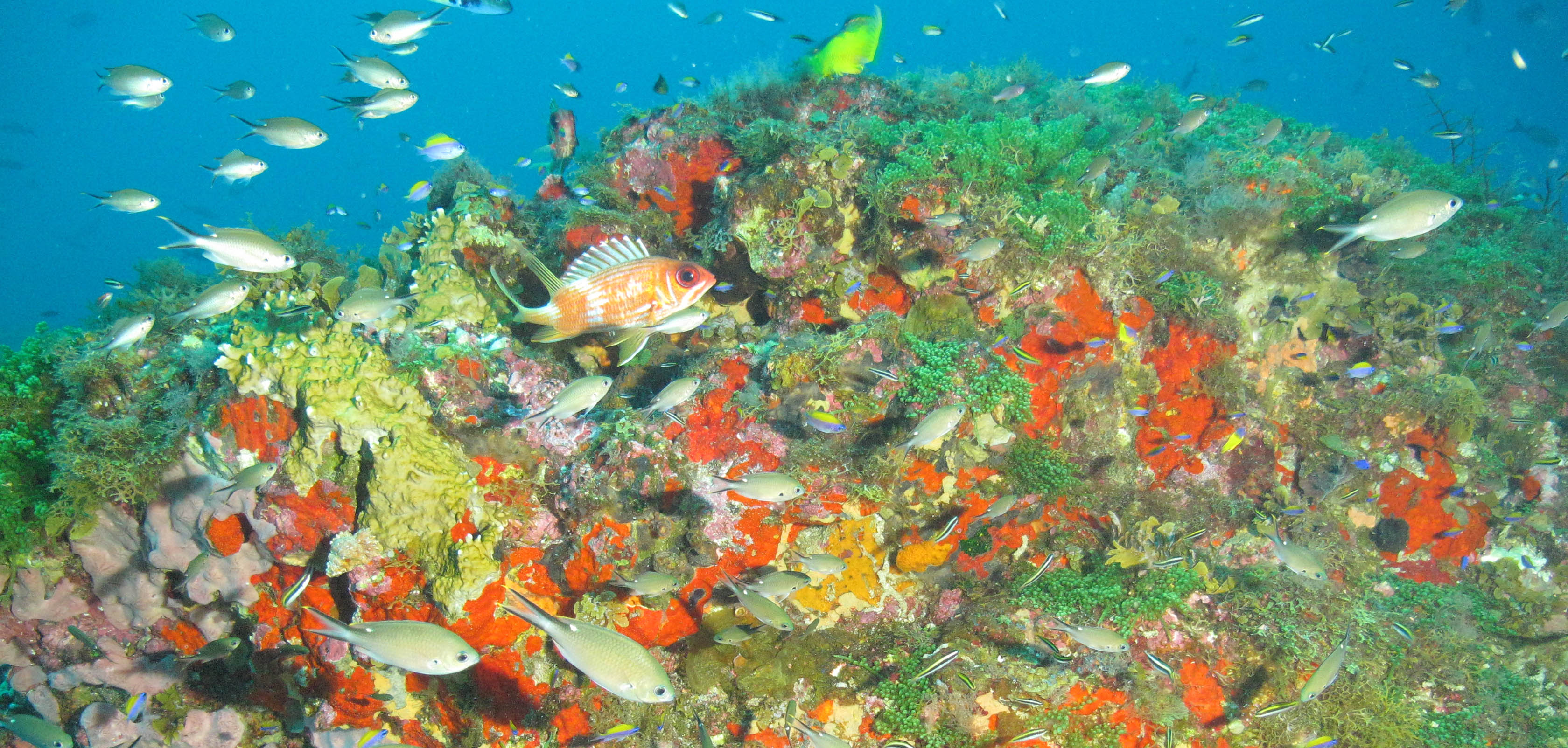 Colorful sponges and bright green algae adorn the cap of Bright Bank in NOAA's Flower Garden Banks National Marine Sanctuary, which is shallow enough to scuba dive. (Image credit: NOAA)