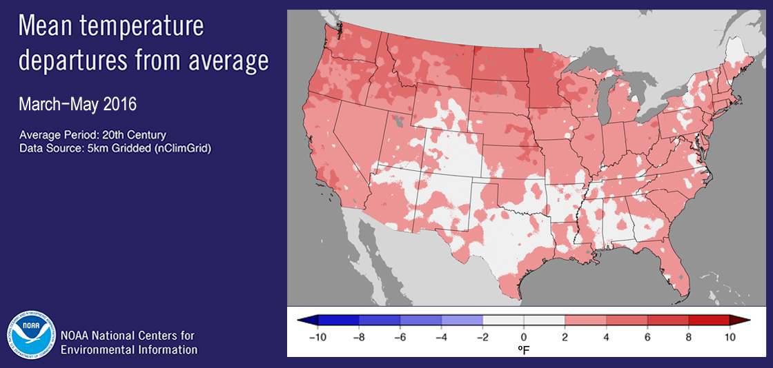 Spring (March-May) 2016 mean temperature departure from average (Image credit: NOAA-NCEI)