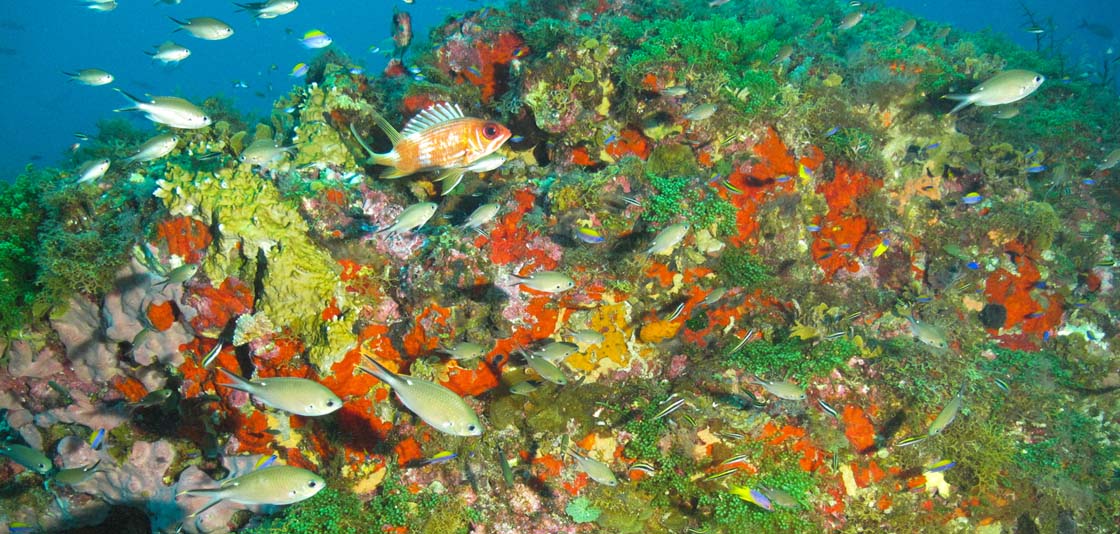 Colorful sponges and bright green fleshy algae adorn the cap of Bright Bank, which is showing signs of damage from excavations and dynamiting activities. (Image credit: NOAA, UNCW-UVP)