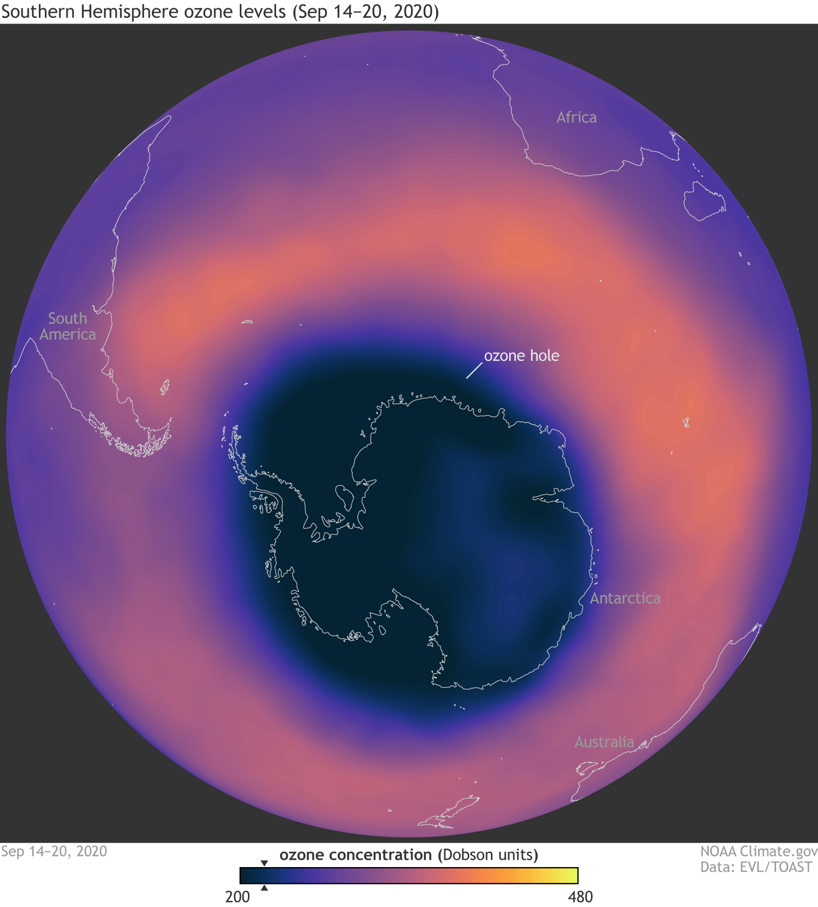 The ozone hole reached its peak size at about 9.6 million square miles (or 24.8 million square kilometers), roughly three times the area of the continental United States, on September 20. Observations revealed the nearly complete elimination of ozone in a four-mile-high column of the stratosphere over the South Pole.