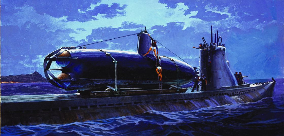 Mounted on the after deck of the “mother” submarine I-24, midget submarine HA-19 is boarded by its crew, Kazuo Sakamaki and Kiyoshi Inagaki, in the pre-dawn hours of December 7, 1941. (Image credit: Painting by Tom W. Freeman, courtesy of Valor in the Pacific National Historical Park)