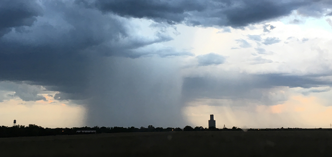 A curtain of rain falls from dark clouds during an evening storm near Ransom, Kansas. (Image credit: Matthew Mahalik, NOAA NSSL OUCIMMS)