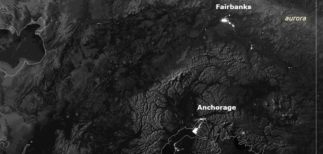 This image of Alaska was taken by the Visible Infrared Imaging Radiometer Suite's (VIIRS) Day-Night Band aboard NOAA's Suomi NPP satellite. The new JPSS-1 satellite will also have this instrument, which can see visible-spectrum light at night. This band allows forecasters to view features such as clouds, fog, smoke and even lights at night, which is an important feature for states like Alaska that have long nights in winter. (Image credit: NOAA NESDIS)
