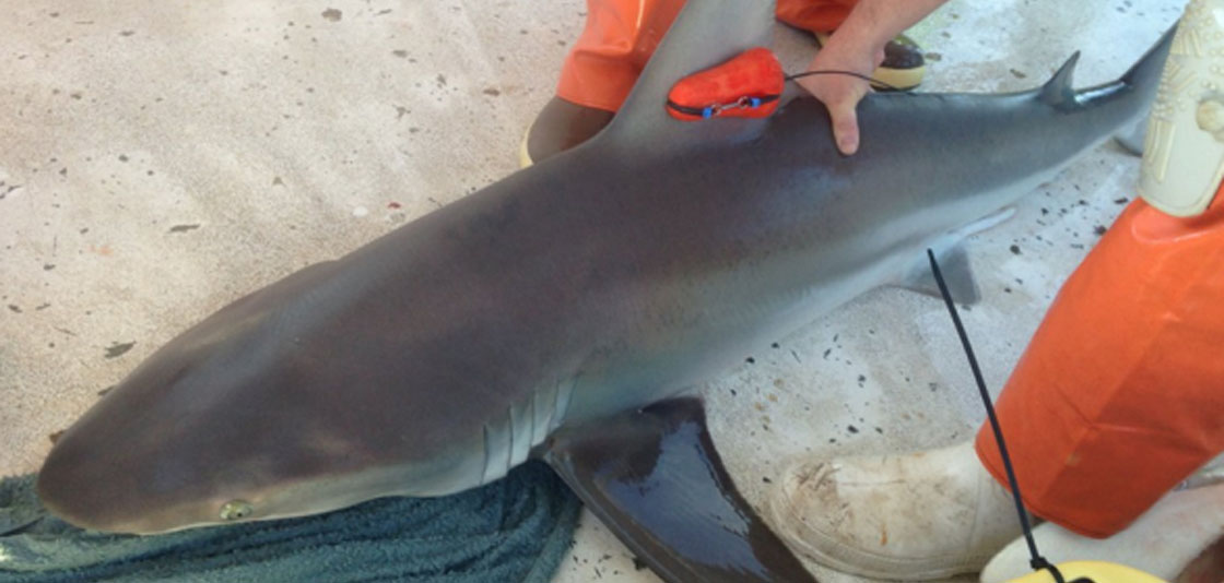 Researchers tag a dusky shark as part of a Bycatch Reduction Engineering Program-funded study to record its behavior. (Image credit: NOAA, University of New England)