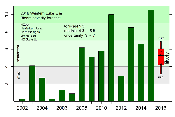 The 2016 bloom is expected to measure 5.5 on the severity index, but could range anywhere between 3.0 and 7.0. The forecast is similar to conditions last seen from 2008 to 2010, although the bloom may be as small as that seen in the relatively mild year of 2004.