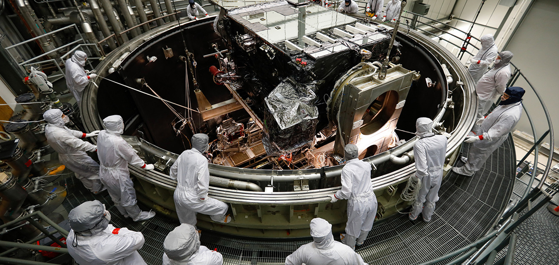 Engineers watch the GOES-S Satellite being lowered into the thermal vacuum chamber. (Image credit: NOAA)