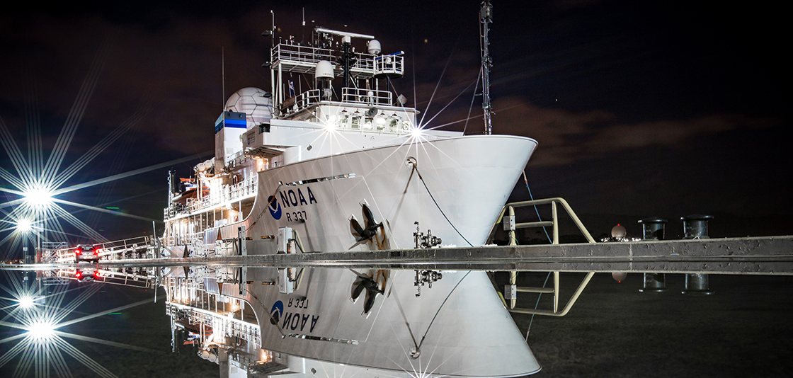 NOAA Ship Okeanos Explorer in Pascagoula, Mississippi, at night during the Gulf of Mexico 2018 expedition. (Image credit: NOAA)