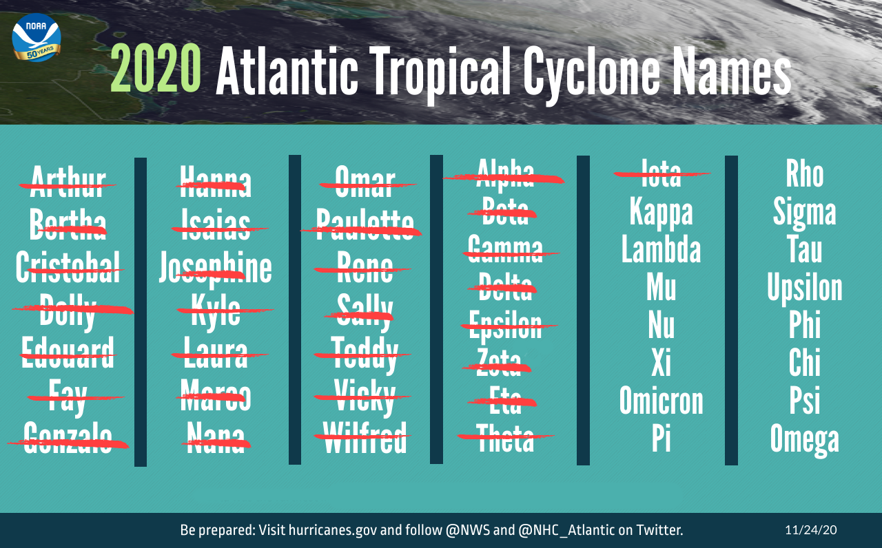 This image from NOAA's GOES-16 satellite on September 14, 2020, shows five tropical systems spinning in the Atlantic basin at one time. From left to right: Hurricane Sally in the Gulf of Mexico, Hurricane Paulette east of the Carolinas, the remnants of Tropical Storm Rene in the central Atlantic, and Tropical Storms Teddy and Vicky in the eastern Atlantic. A total of 10 named storms formed in September 2020 — the most for any month on record. (Image credit: NOAA)