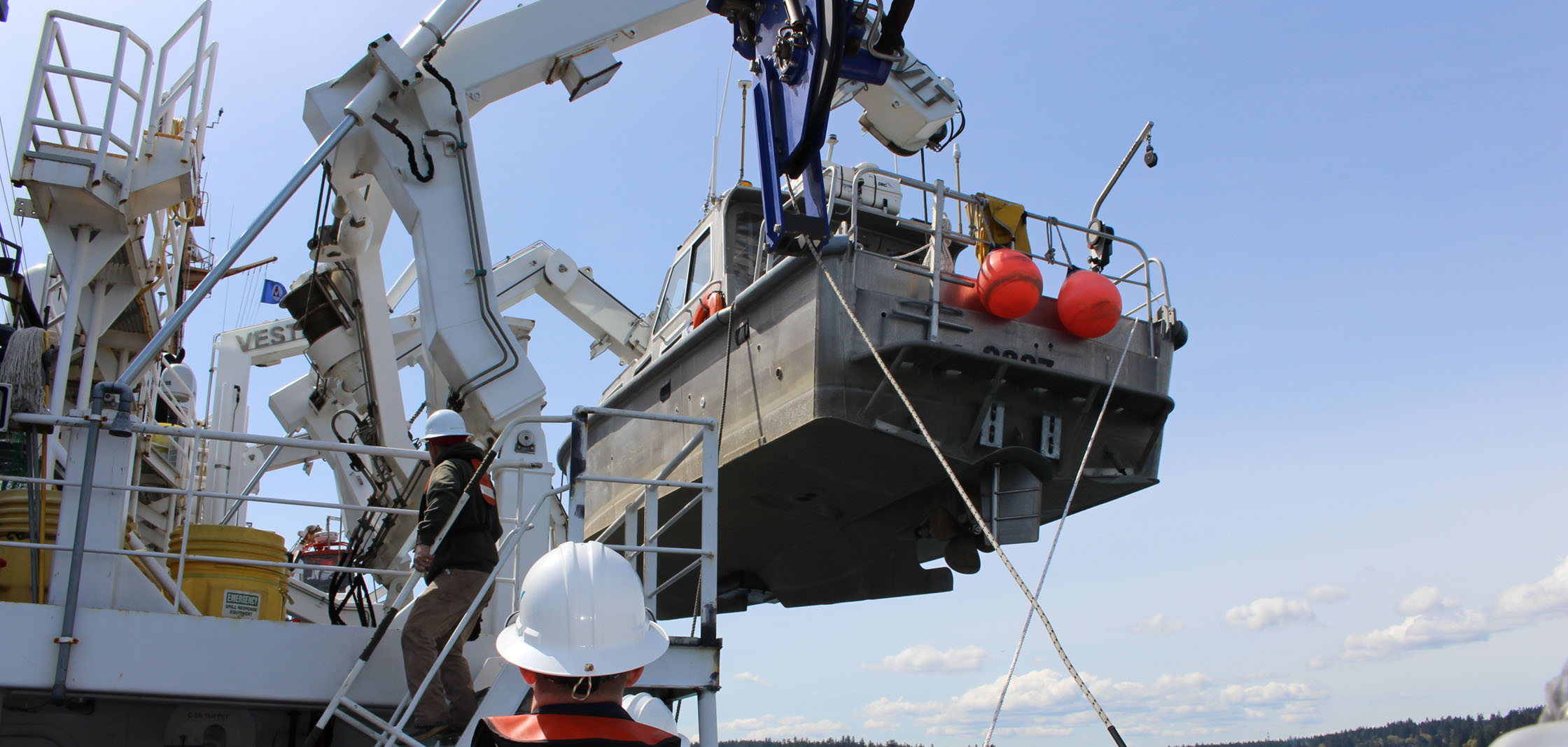 The crew of NOAA Ship Fairweather crew lower a launch into Puget Sound, Washington, for Hydrographic Systems Readiness Review testing. Since 2015, scientists have been gathering data on the Queen Charlotte-Fairweather fault system, a 746-mile long strike-slip fault line that extends from offshore of Vancouver Island, Canada, to the Fairweather Range of southeast Alaska. The team has gathered high resolution bathymetric data through multibeam sonar across 5,792 square miles of the ocean bottom (Image credit: NOAA)