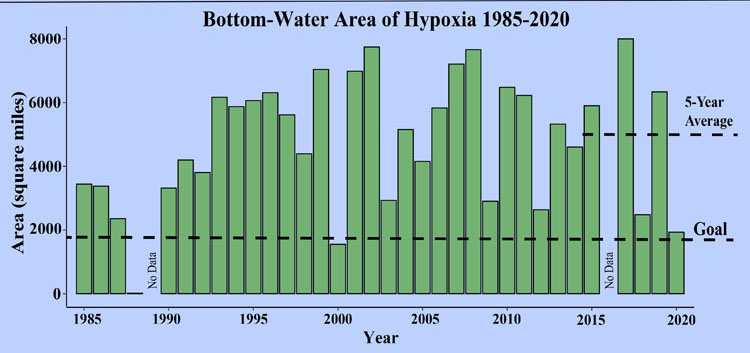 The measured size of the offsite link dead zone offsite link is the third smallest in the 34-year record of surveys. The average hypoxic zone over the past five years is 5,408-square miles, which is 2.8 times larger than the 2035 target set by the Hypoxia Task Force.