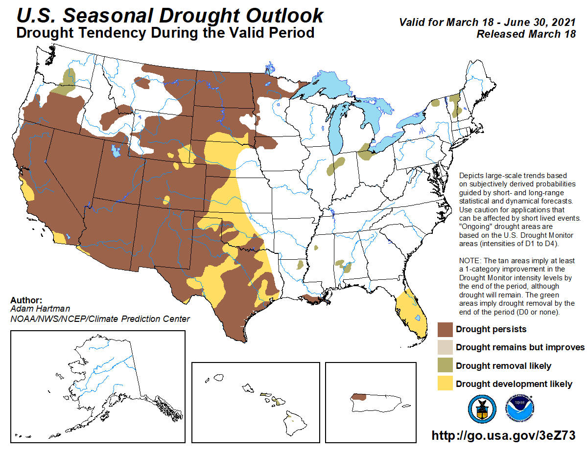 Warmer-than-average temperatures this spring and low soil moisture will allow drought conditions to develop and expand in the southern and central Great Plains as well as southern Florida. In the northern Plains, existing drought could intensify if subnormal spring precipitation occurs. Drought improvement during the next few months is likely in the Pacific Northwest, Midwest, New England and Hawaii. In drought-affected areas, rangeland, pastures, and winter wheat have already experienced adverse effects, which were exacerbated by the severe February cold outbreak.