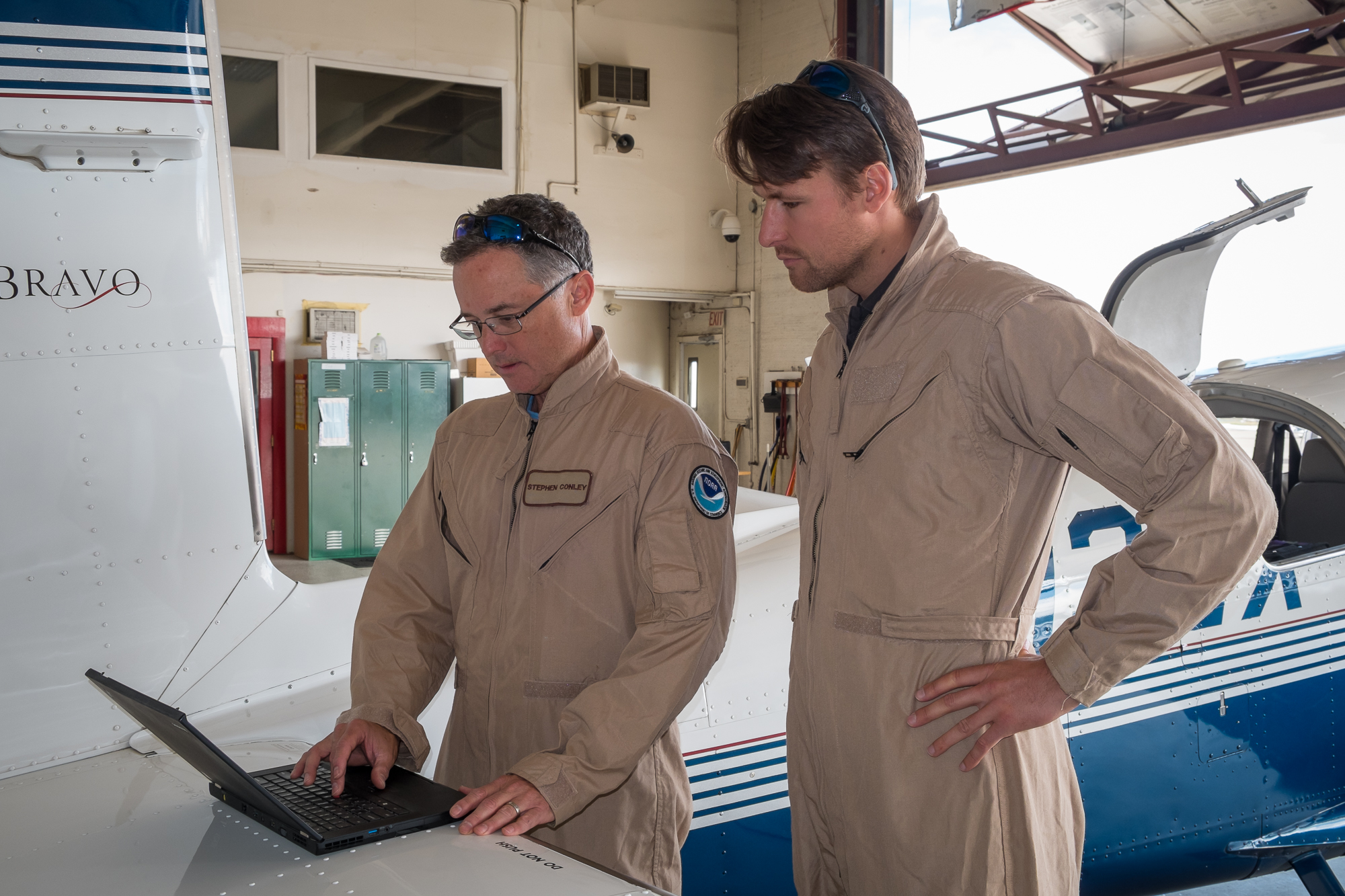 Stefan Schwietzke (right) and pilot Stephen Conley prepare for a 2014 research flight in Colorado. (Image credit: Will Von Dauster/NOAA)