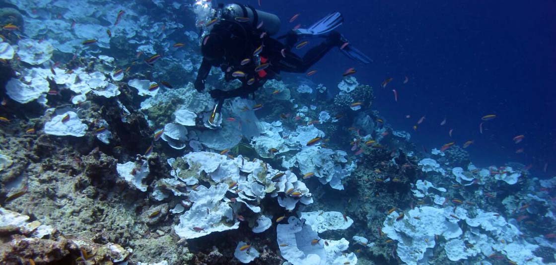Seascape of bleached plating Montipora corals on Jarvis' forereef. (Image credit: Cohen Lab-WHOI)