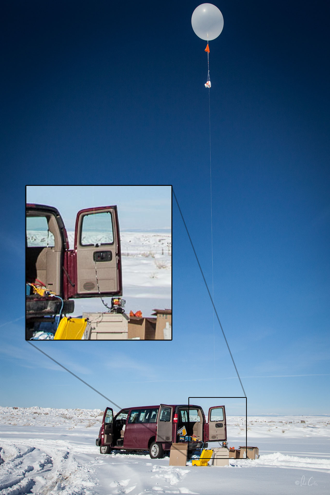 A creative and effective approach to data collection: NOAA scientists used an instrumented weather balloon tethered to a motorized fishing rod to study the rate of ozone formation in Utah’s remote Uinta Basin in 2013. (Image credit: NOAA)