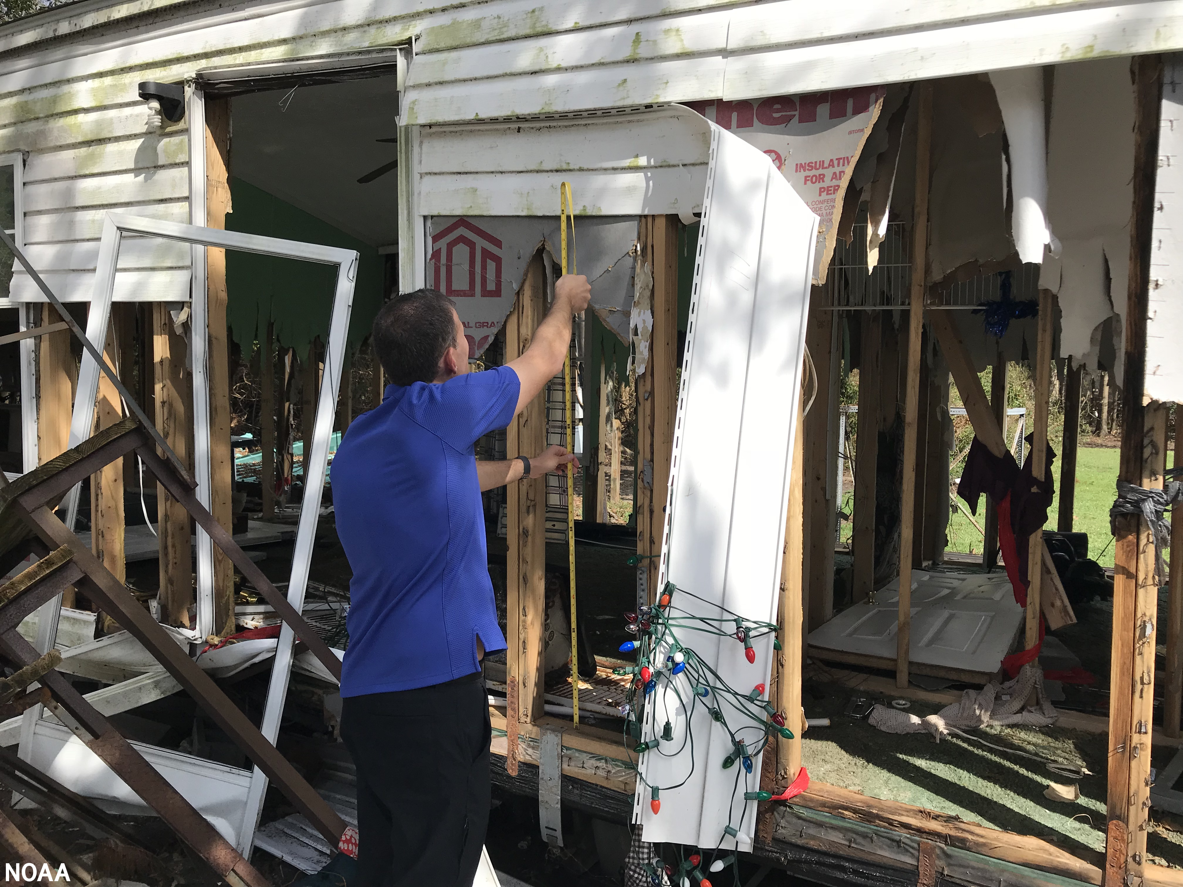 When Hurricane Florence crossed the North Carolina, coast on September 14, 2018, it brought hurricane-force winds and — as forecasted — strong storm surge. Jamie Rhome, now acting director of NOAA’s National Hurricane Center, measures the impact of storm surge at a heavily damaged home in New Bern, North Carolina on September 26, 2018. (Image credit: NOAA)