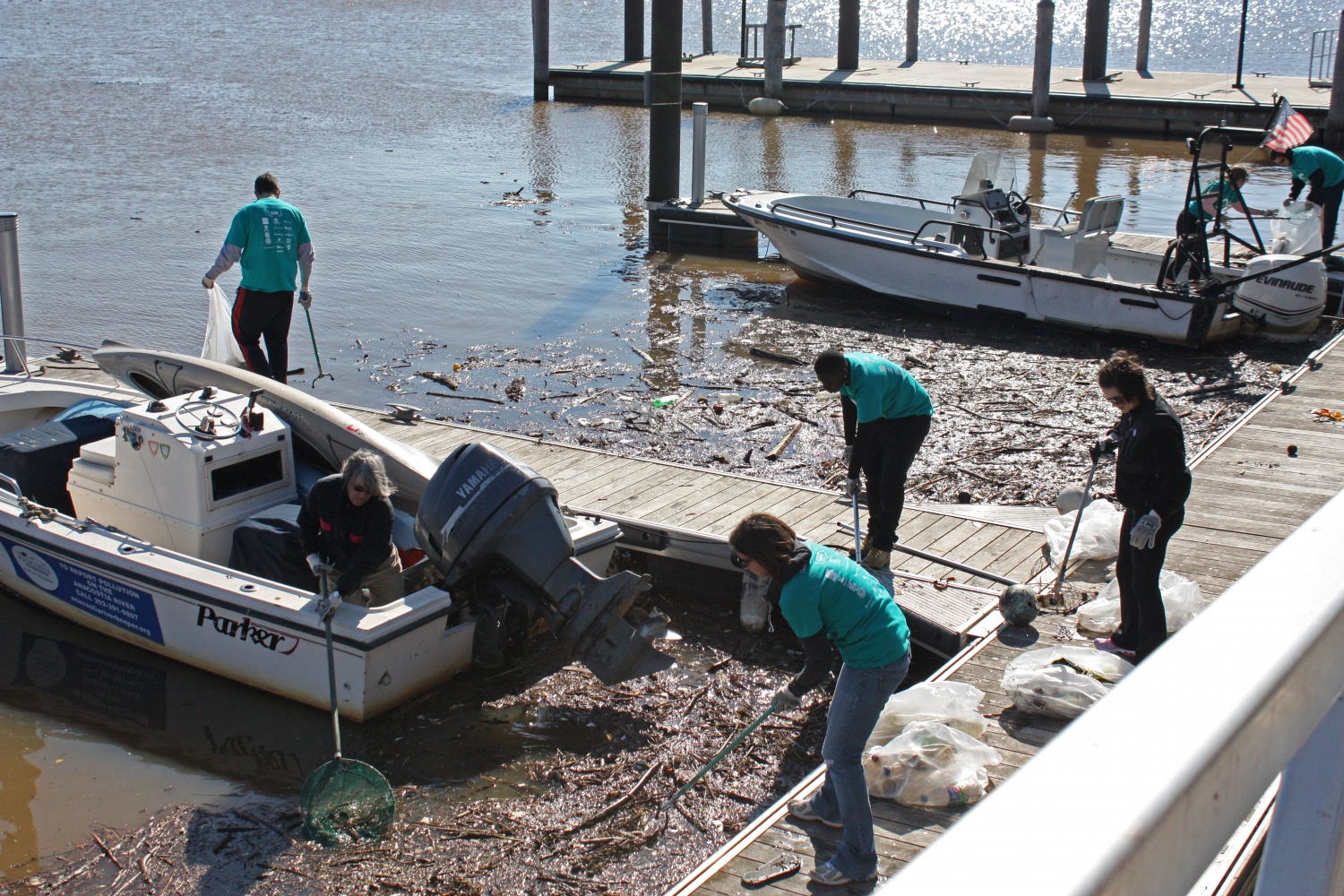 Volunteers at the Anacostia River Watershed annual cleanup in Washington, D.C. metro area fish out marine debris from the river's waterfront. (Image credit: NOAA)