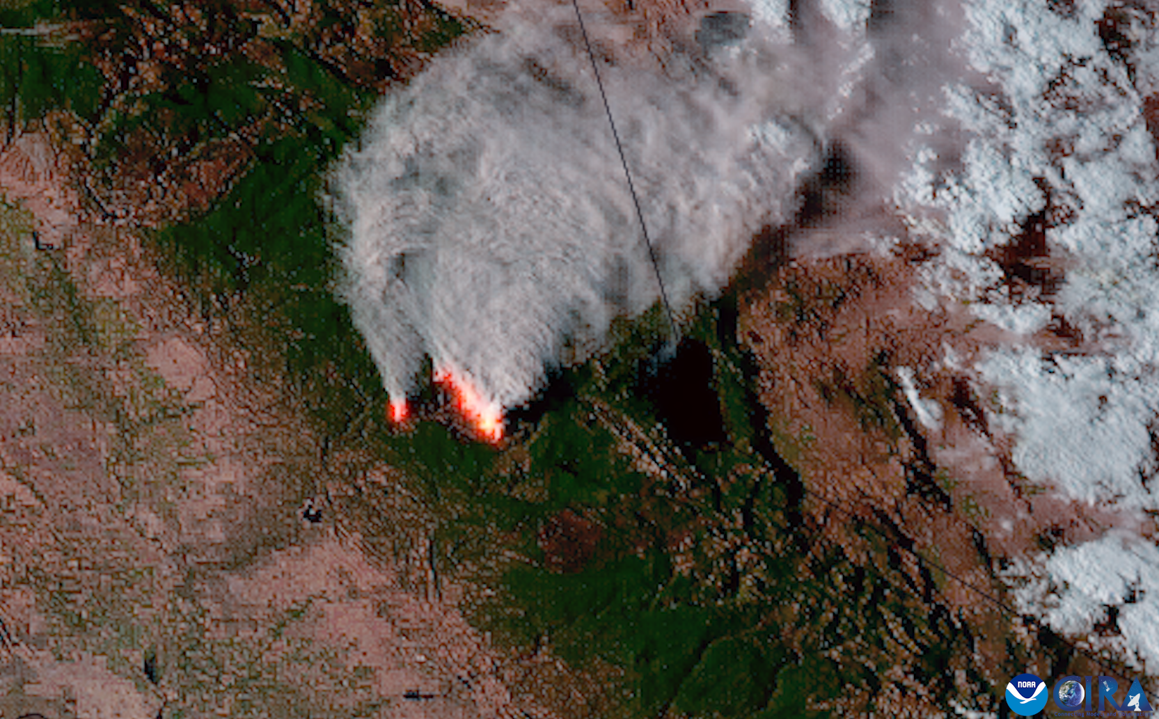 The Mosquito Wildfire burning in California as seen from NOAA’s GOES-18 satellite on September 13, 2022. (Image credit: NOAA)