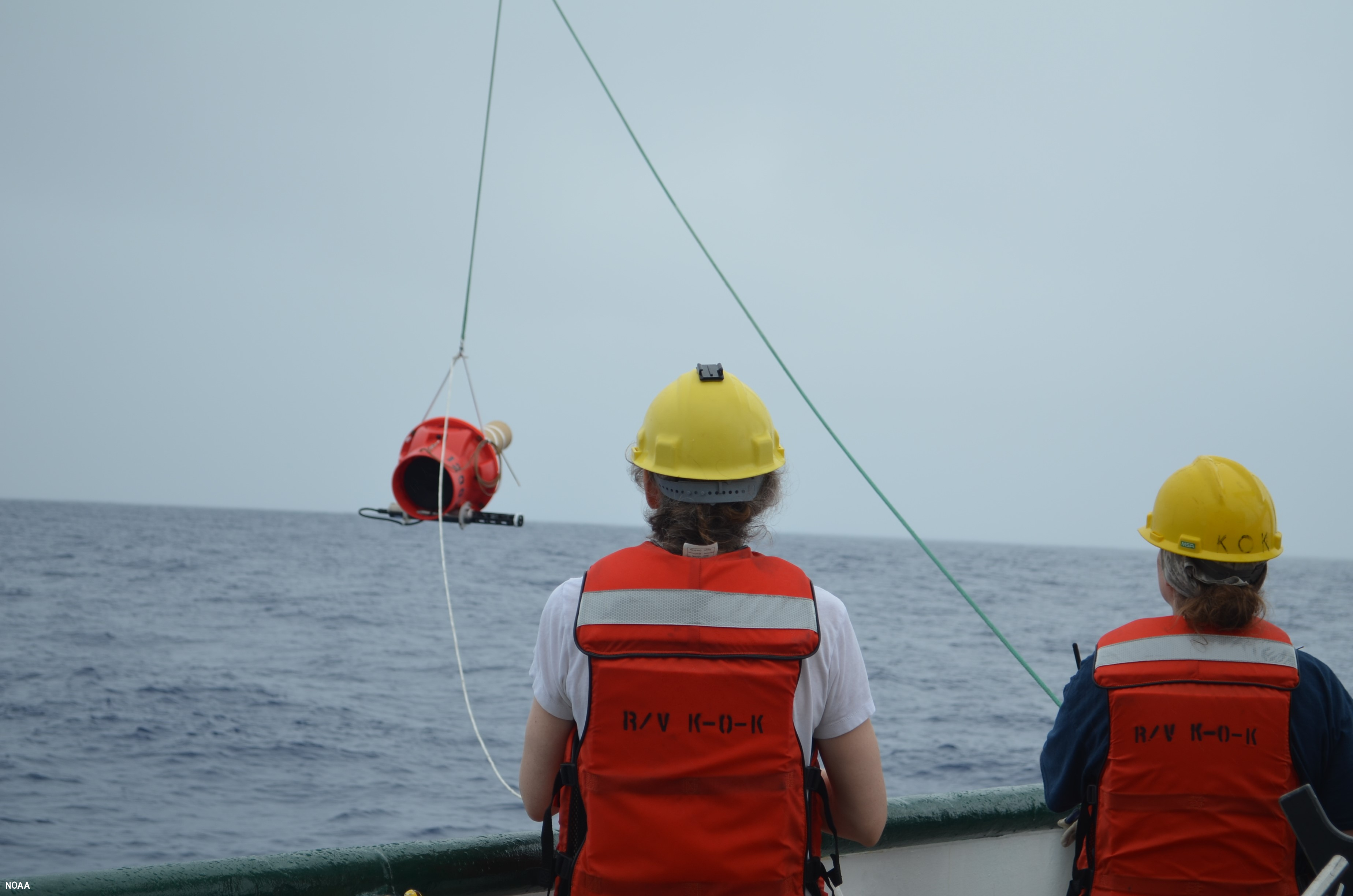 NOAA Affiliates Dr. Elizabeth Steffen (left) and Marine Tech Elizabeth Ricci (right) deploy a Deep Sounding Oceanographic Lagrangian Observer (SOLO) Argo float from the R/V Kaʻimikai-O-Kanaloa in 2018. The Deep SOLO float was developed by the Scripps Institute of Oceanography Instrument Development Group (SIO IDG), and this was the first Deep SOLO float to be deployed by NOAA Affiliates. (Image credit: NOAA)