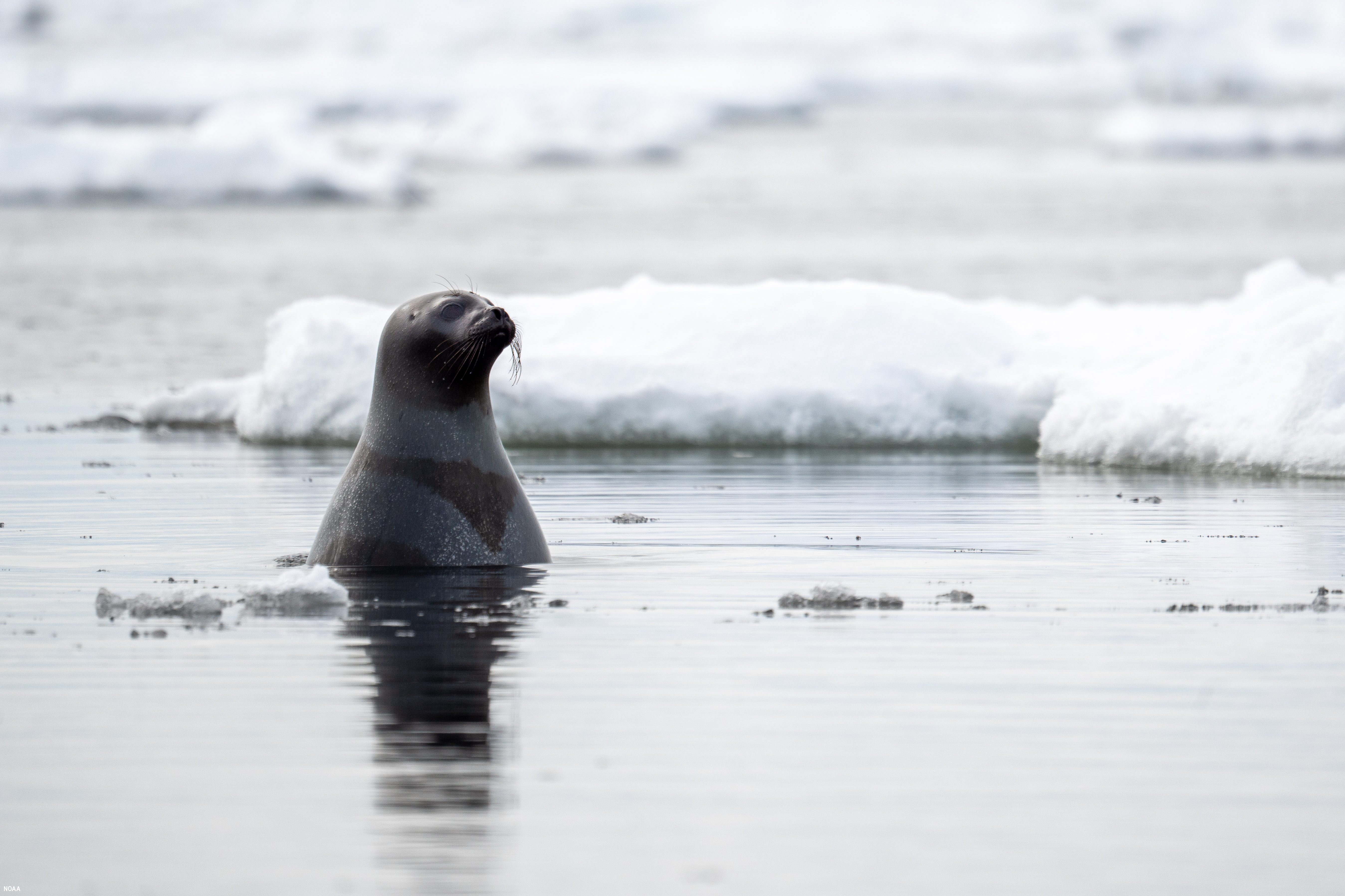 An adult female ribbon seal looks around among ice floes in the Bering Sea. Credit: NOAA Fisheries/Josh M London. Photo taken while working under authority of NMFS Research Permit #23858. (Image credit: NOAA)