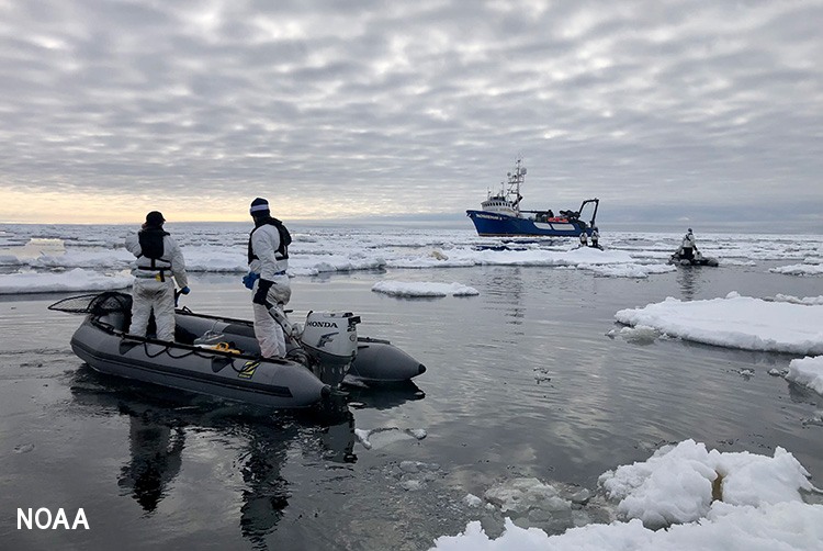 - Co-designing sea-ice prediction and modeling tools ($752,000): NOAA’s Global Ocean Monitoring and Observing Arctic Research Program will fund two new projects that will improve upon existing sea-ice models by integrating new observational data, including tidal data and satellite imagery. Projects will be led by researchers at NOAA’s Cooperative Institutes for Great Lakes Research (CIGLR offsite link) and for Climate, Ocean, and Ecosystem Studies (CICOES offsite link), and one project will be carried out as cooperative research with residents of the Kotzebue Sound region of Alaska.