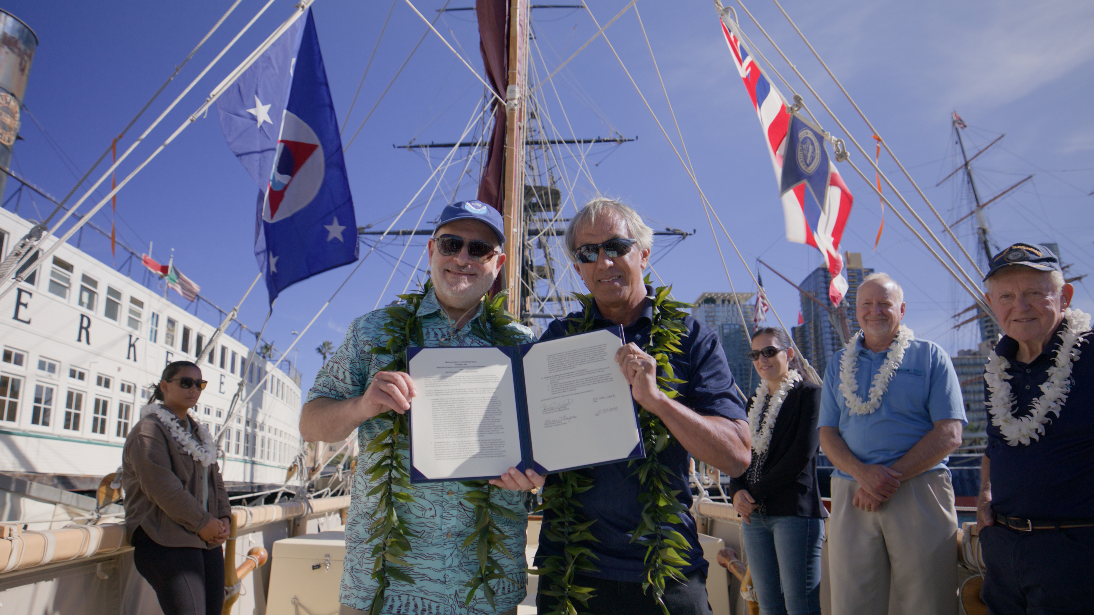 NOAA Administrator Rick Spinrad, Ph.D., and Polynesian Voyaging Society CEO Nainoa Thompson signed the MOU in San Diego, California, aboard Hōkūle‘a. (Image credit: Ryan Miyamoto)
