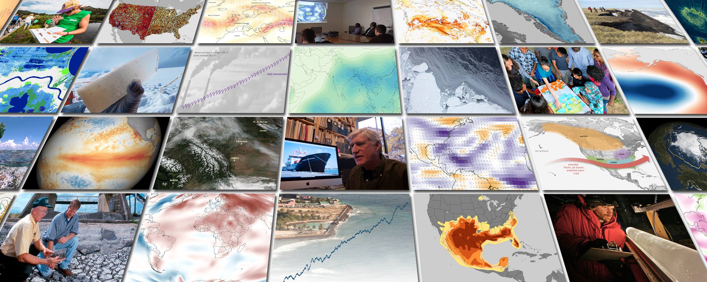 A collage of images used on NOAA's Climate.gov website. Climate.gov offers magazine-style articles about climate science and describes how climate conditions are changing with maps, graphics, features, and videos, as well as classroom-ready teaching resources matched to grade levels and science learning standards. (Image credit: NOAA Climate.gov)